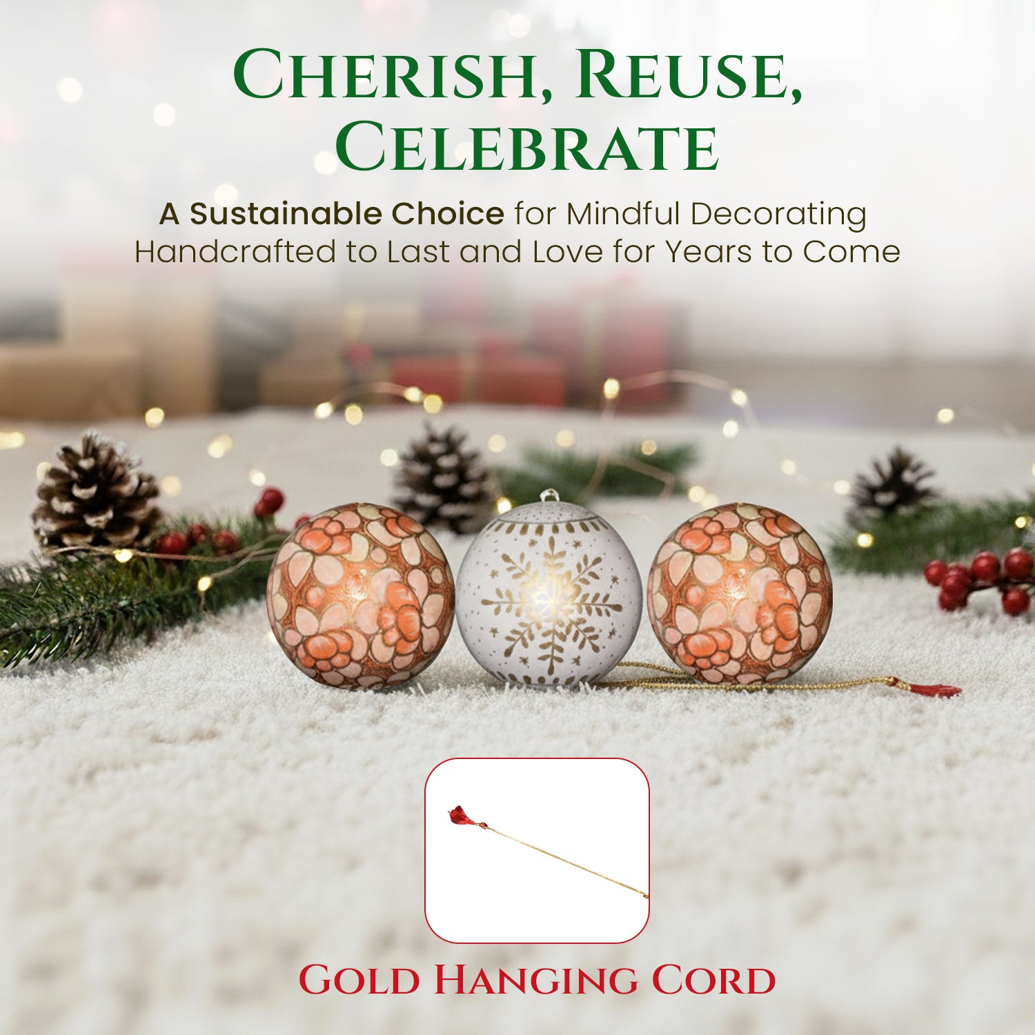 Hand Painted Papier Mache Christmas Baubles – Set of 3 Handmade Christmas Decorations, Eco-Friendly Presentation Box, Traditional Xmas Tree Decorations (White-Orange)