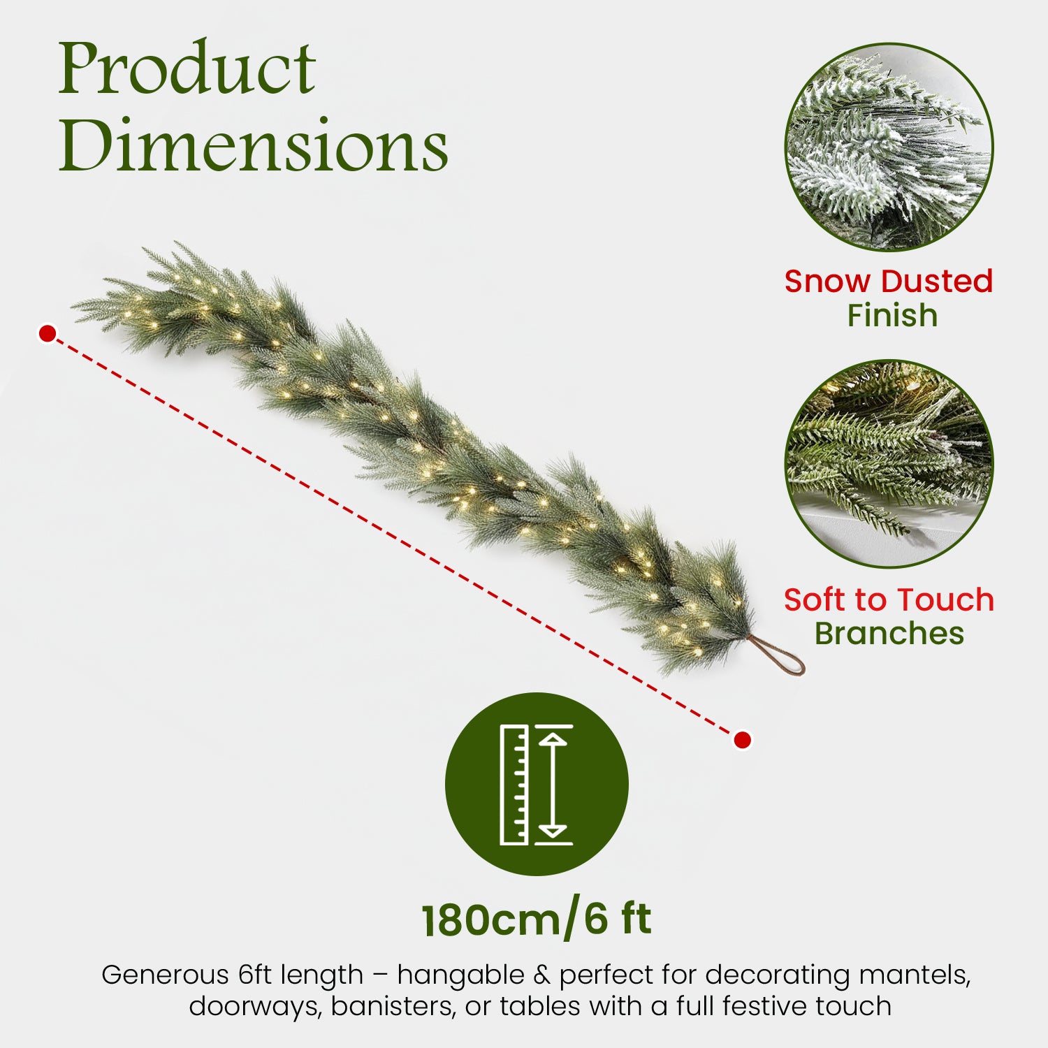 Luxury Snow Flocked Christmas Garland with Lights 1.8m/6ft for Christmas Decorations, Mixed Green Garland, Warm White Lights Indoor Decoration for Fireplace Stair Door Table
