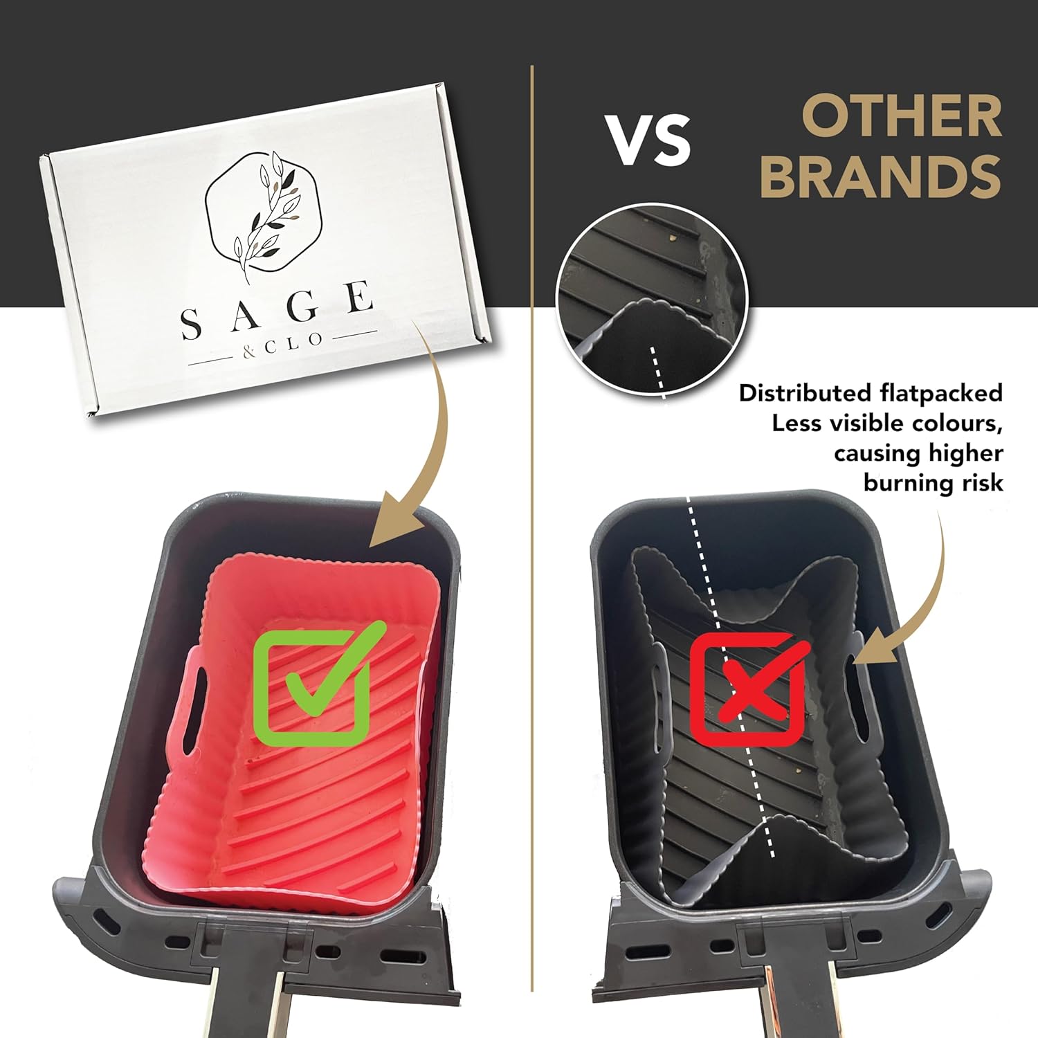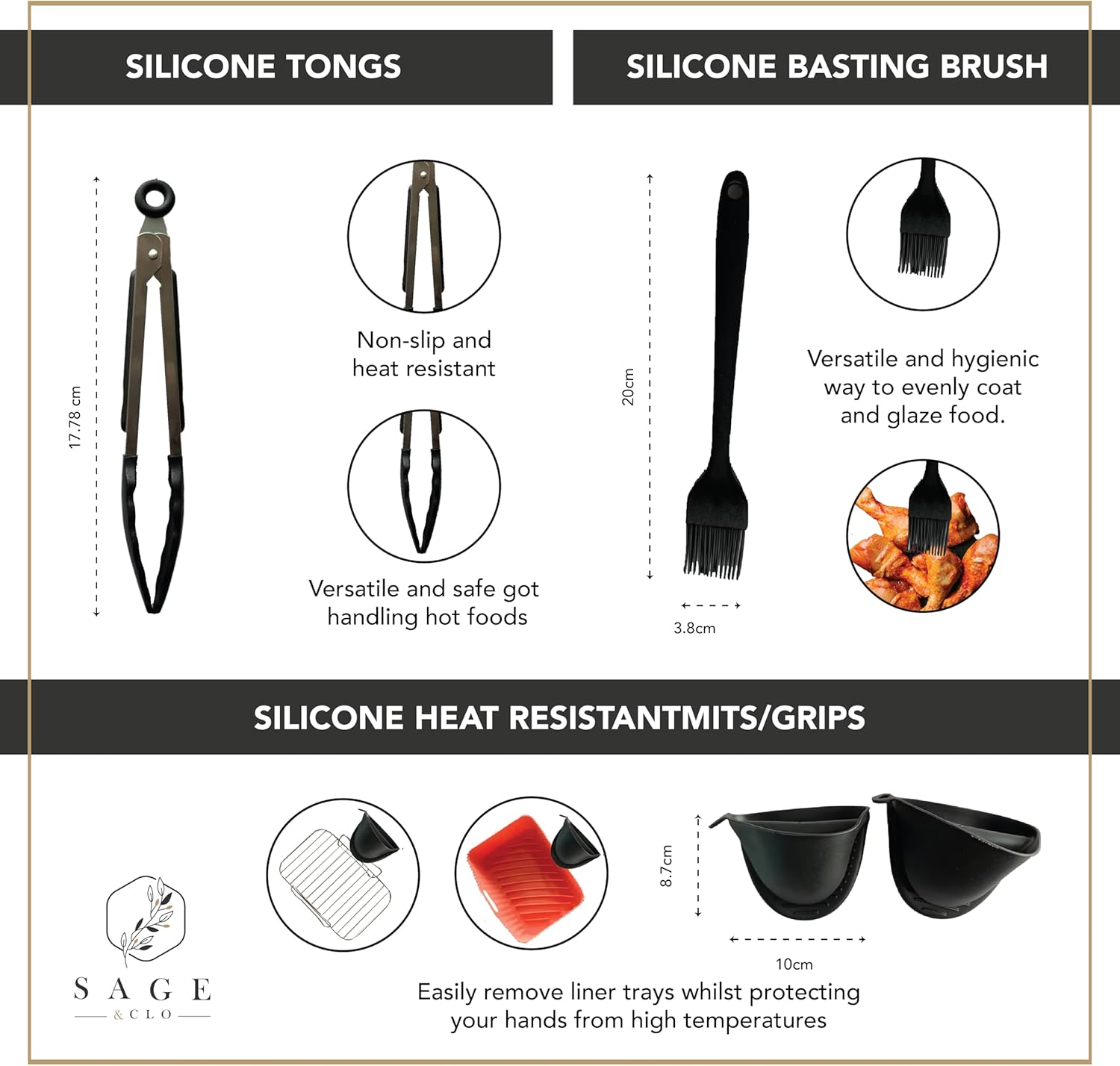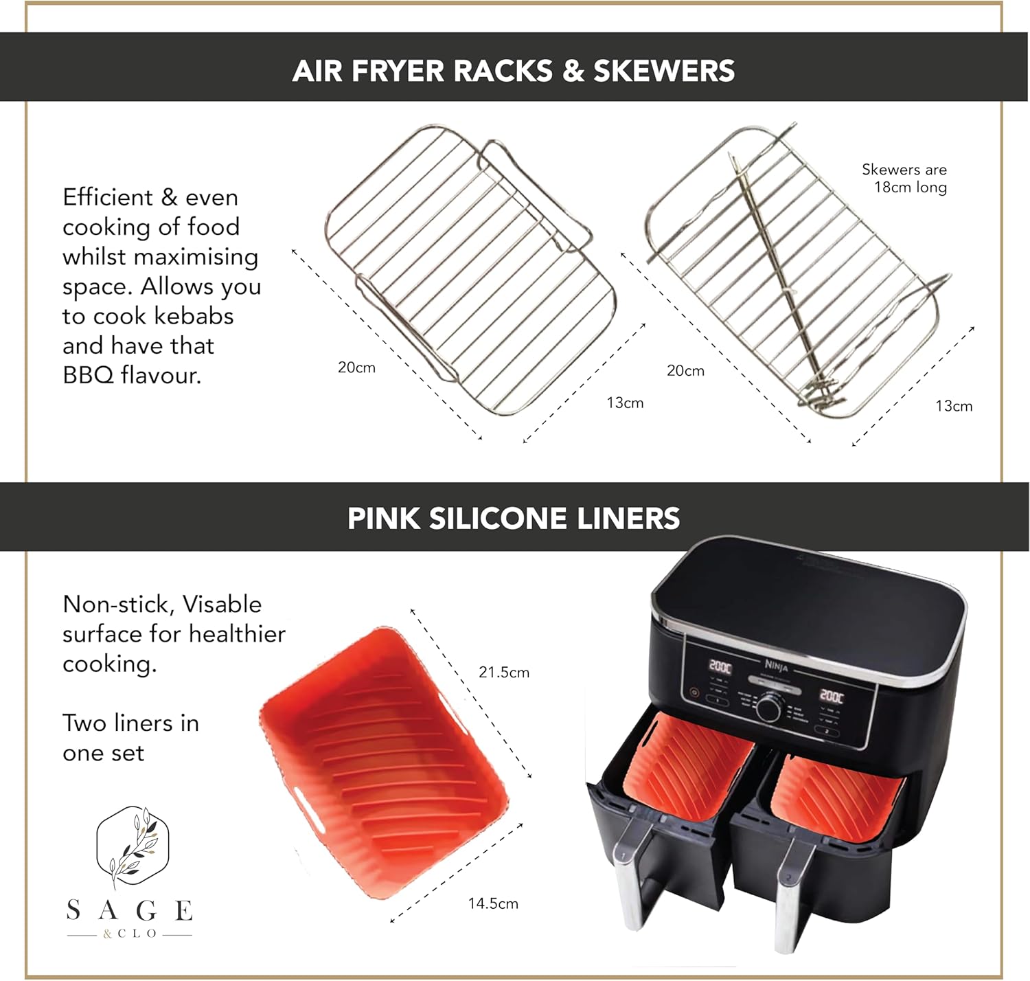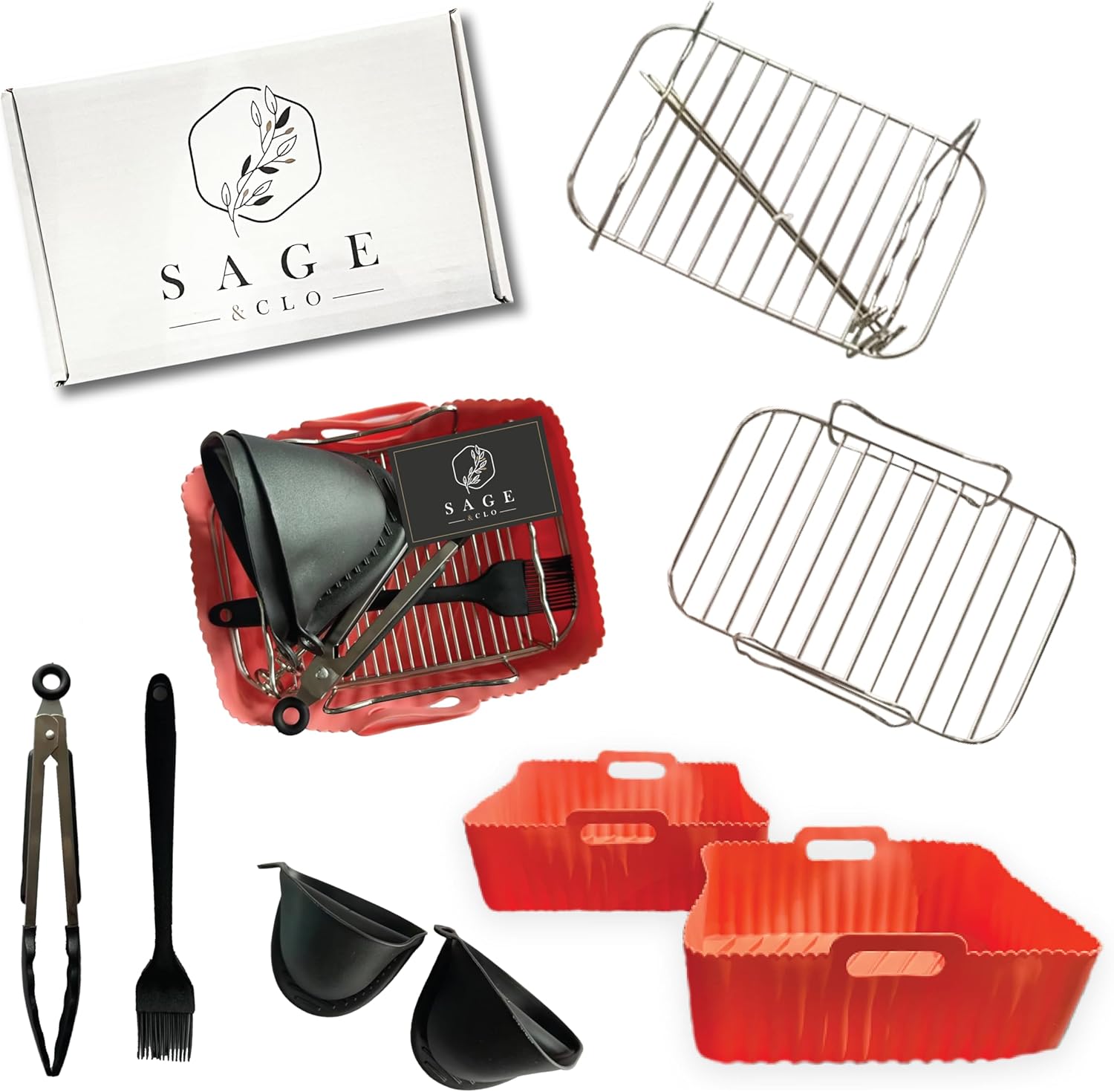 Sage & Clo Air Fryer Accessories 12Pcs for Ninja, Tower, Vortex, Salter, Cosori 7.6L-9.5L Dual Air Fryer, high quality Silicone Liners, Racks, Mitts, Pastry Brush, Skewers and Tongs, in a branded presentation box.